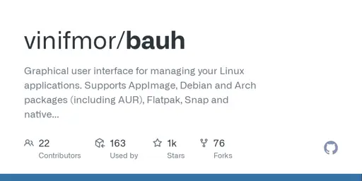 GitHub - vinifmor/bauh: Graphical user interface for managing your Linux applications. Supports AppImage, Debian and Arch packages (including AUR), Flatpak, Snap and native Web applications