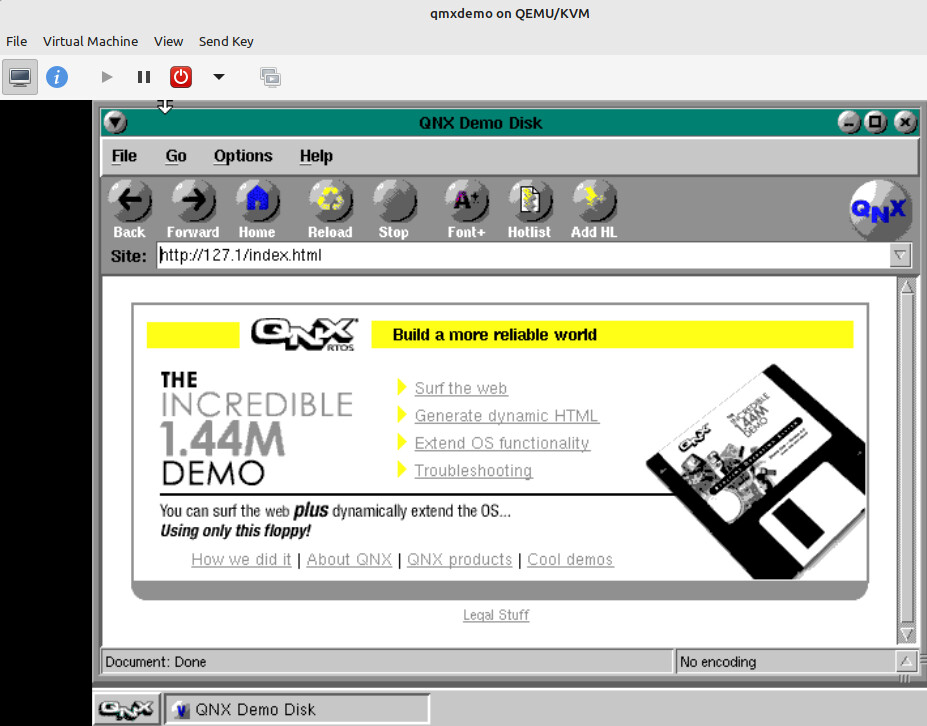 To demonstrate the OS's capability and relatively small size, in the late 1990s QNX released a demo image that included the POSIX-compliant QNX 4 OS, a full graphical user interface, graphical text editor, TCP/IP networking, web browser and web server that all fit on a bootable 1.44 MB floppy disk for the 386 PC. - wiki
